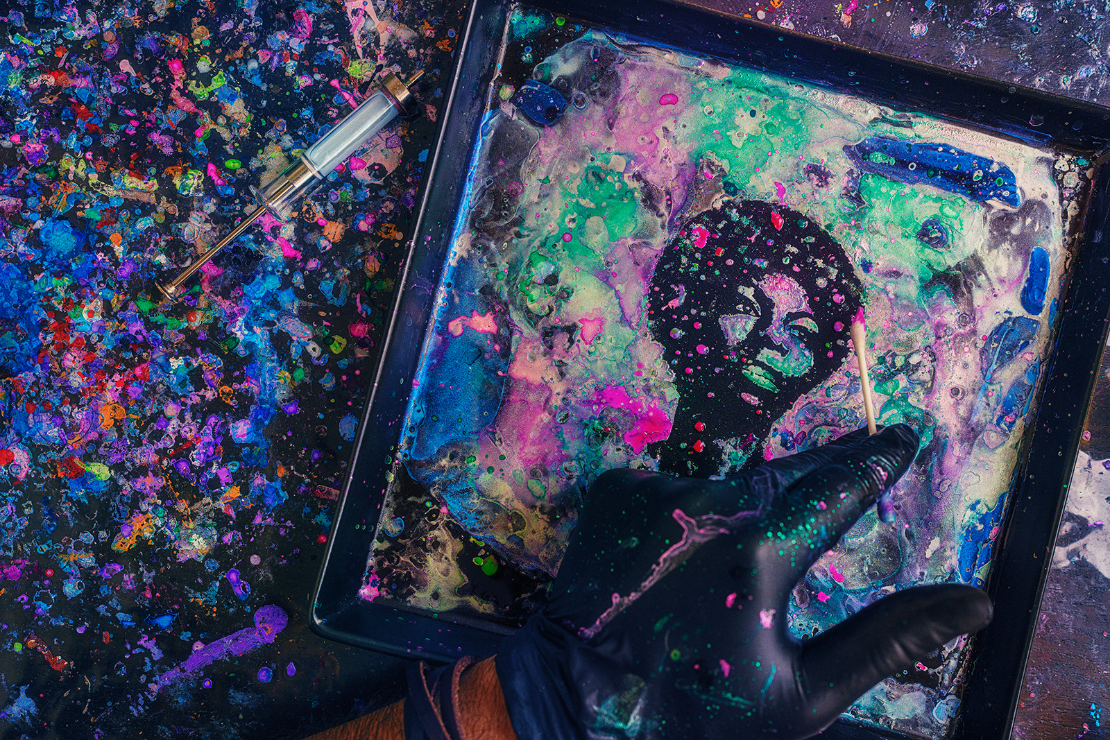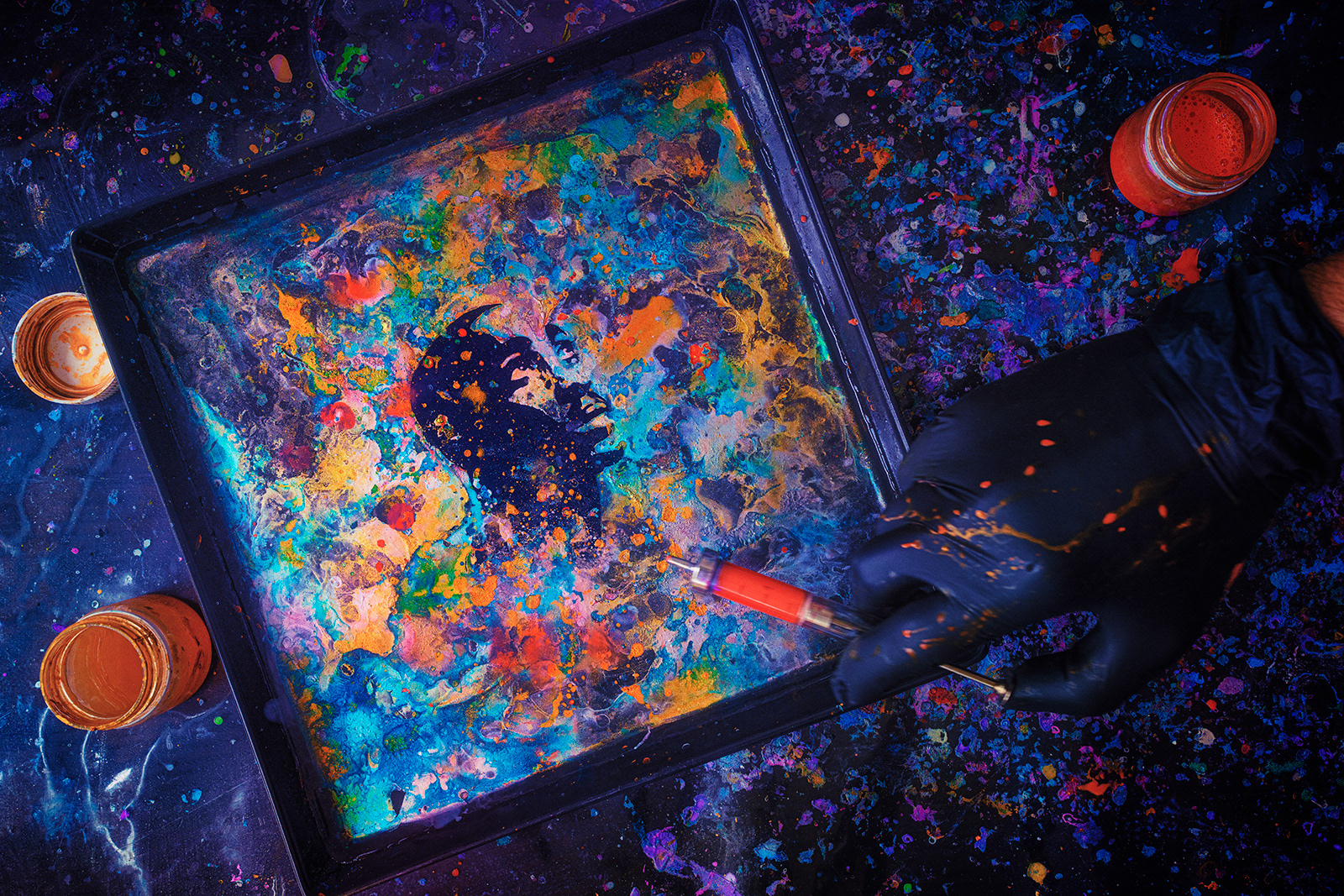 This experimental project is a continuation of my past work in a technique that I have been developing for 10 years. This time I decided to create portraits of some of my favorite musical artists. In this project, I used ink, oil and water, to create stunning and unique representation of the fluid dynamics captured in the portraits. The process of creating a fluid portraits is challenging. The nature of liquids is unpredictable and requires multiple attempts to achieve the desired result. This is meditative and exciting process, as the liquids move and blend in unexpected ways.